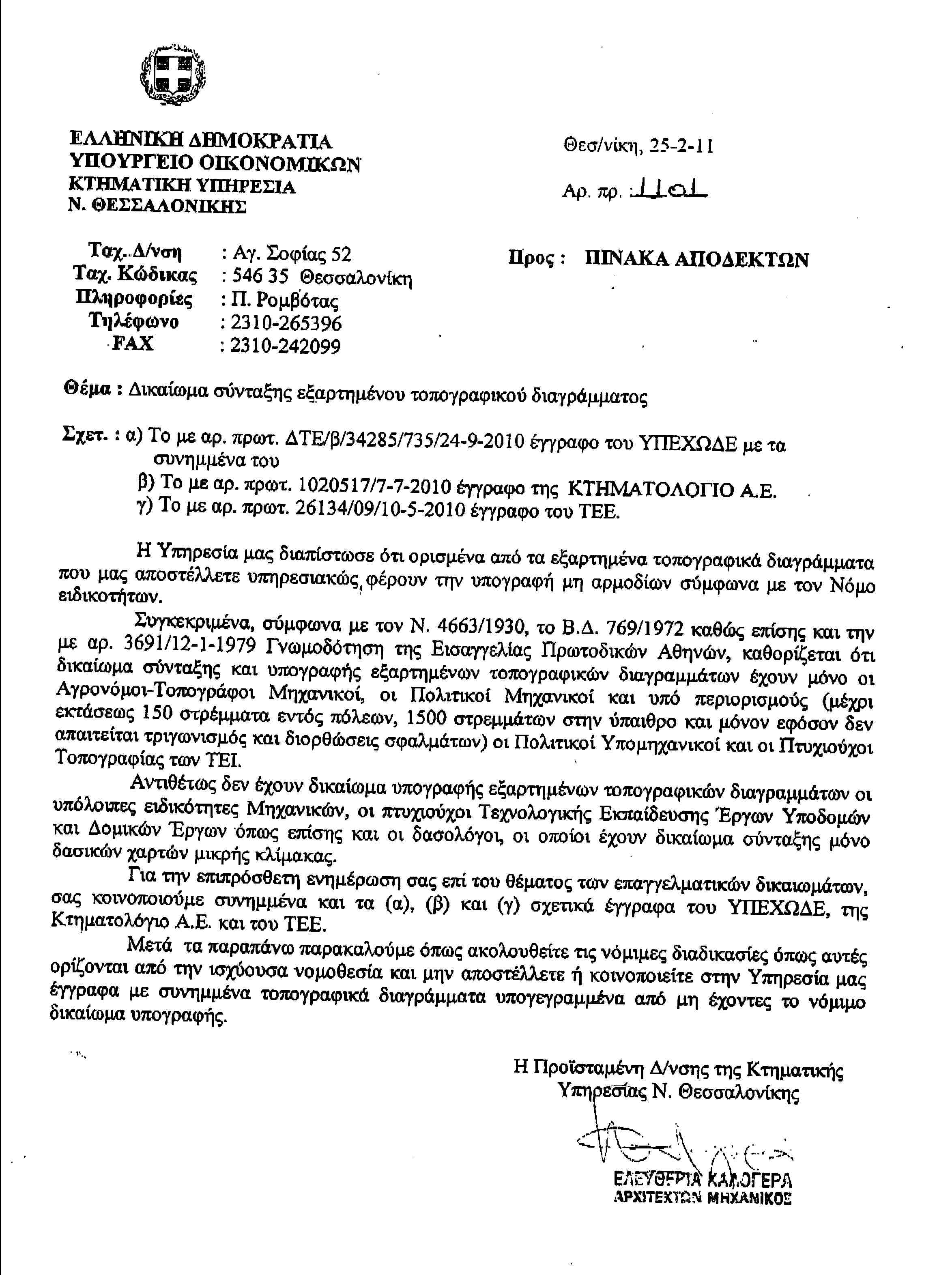 Επιστολή της Κτηματικής Υπηρεσίας Ν. Θεσσαλονίκης σχετικά με το δικαίωμα σύνταξης εξαρτημένων τοπογραφικών διαγραμμάτων (25/02/2011) (pdf)