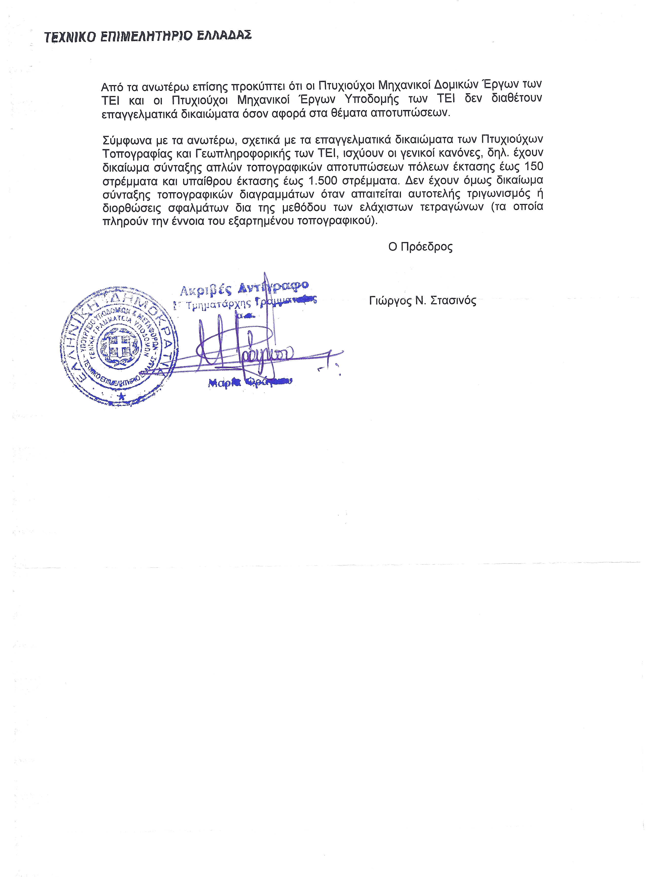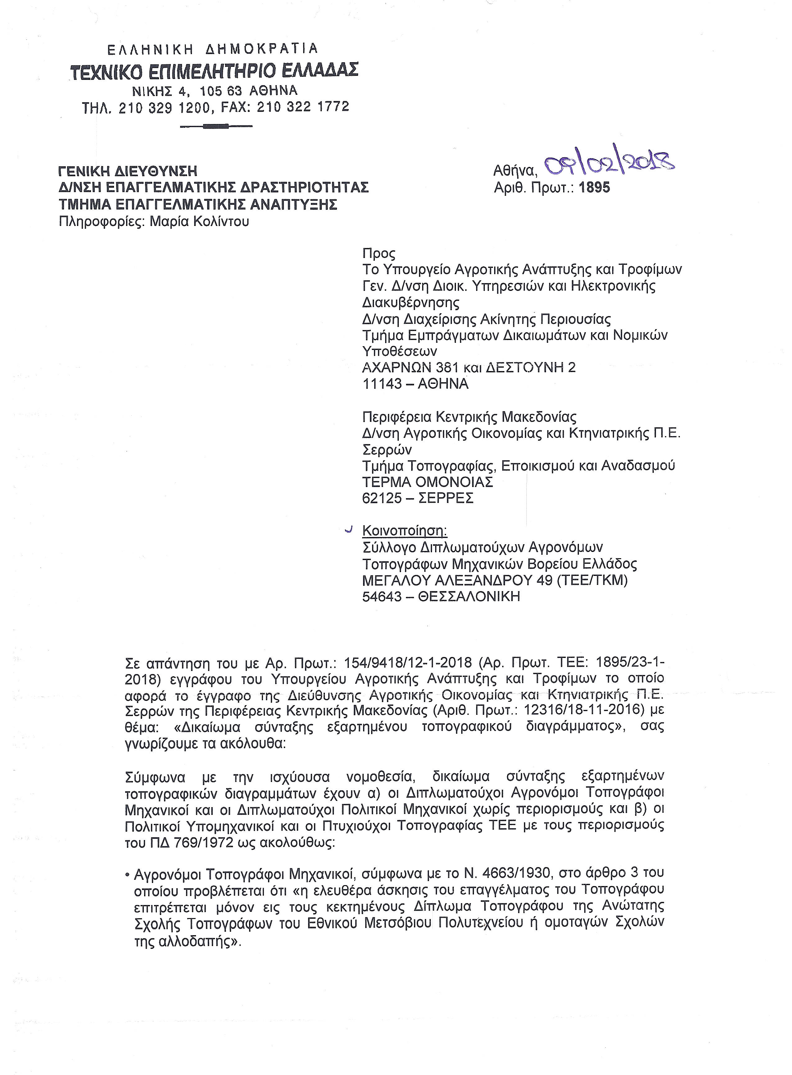 Απάντηση του ΤΕΕ προς τον Πρόεδρο του ΣΔΑΤΜΒΕ σχετικά με το δικαίωμα σύνταξης εξαρτημένων τοπογραφικών διαγραμμάτων (pdf)